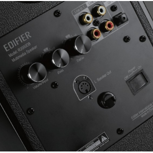 Conectori RCA, OPTICAL INPUT, telecomanda wireless, bass reflex pe panoul frontal.