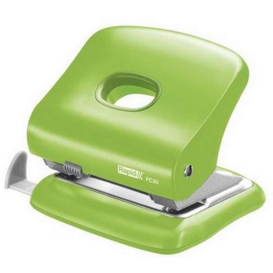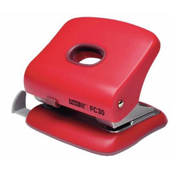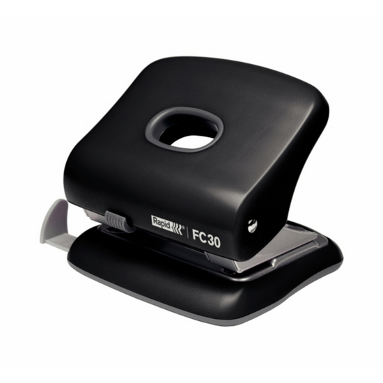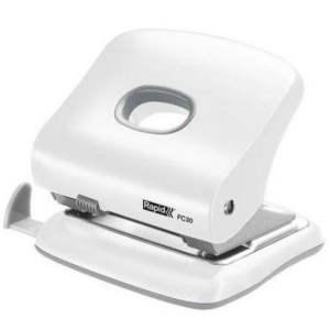 Perforator de birou cu corp si clapa metalice ranforsate cu plastic ABS, baza cauciucata antialunecare.