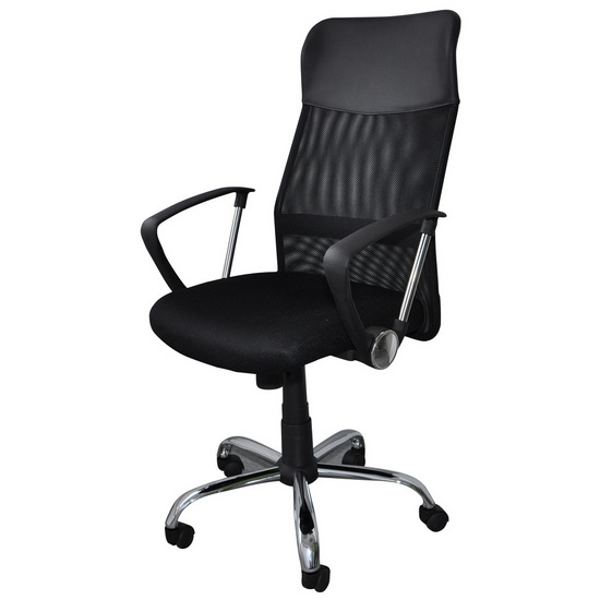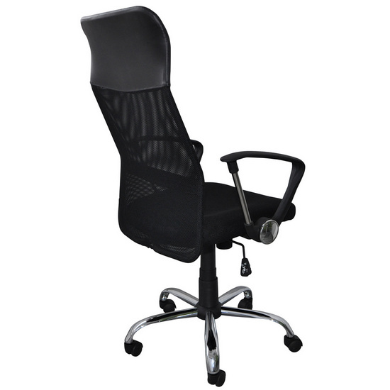 Baza din otel prevazuta cu rotile, spatar ergonomic tapitat cu plasa, sezut tapitat cu piele ecologica.