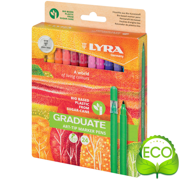 Markere bio realizate din 64% plastic bio-bazat din trestie de zahar (corp, dop, capac) - standard ASTM D6888.