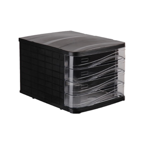 Contine 4 sertare transparente (50 mm inaltime), culisante, cu maner.